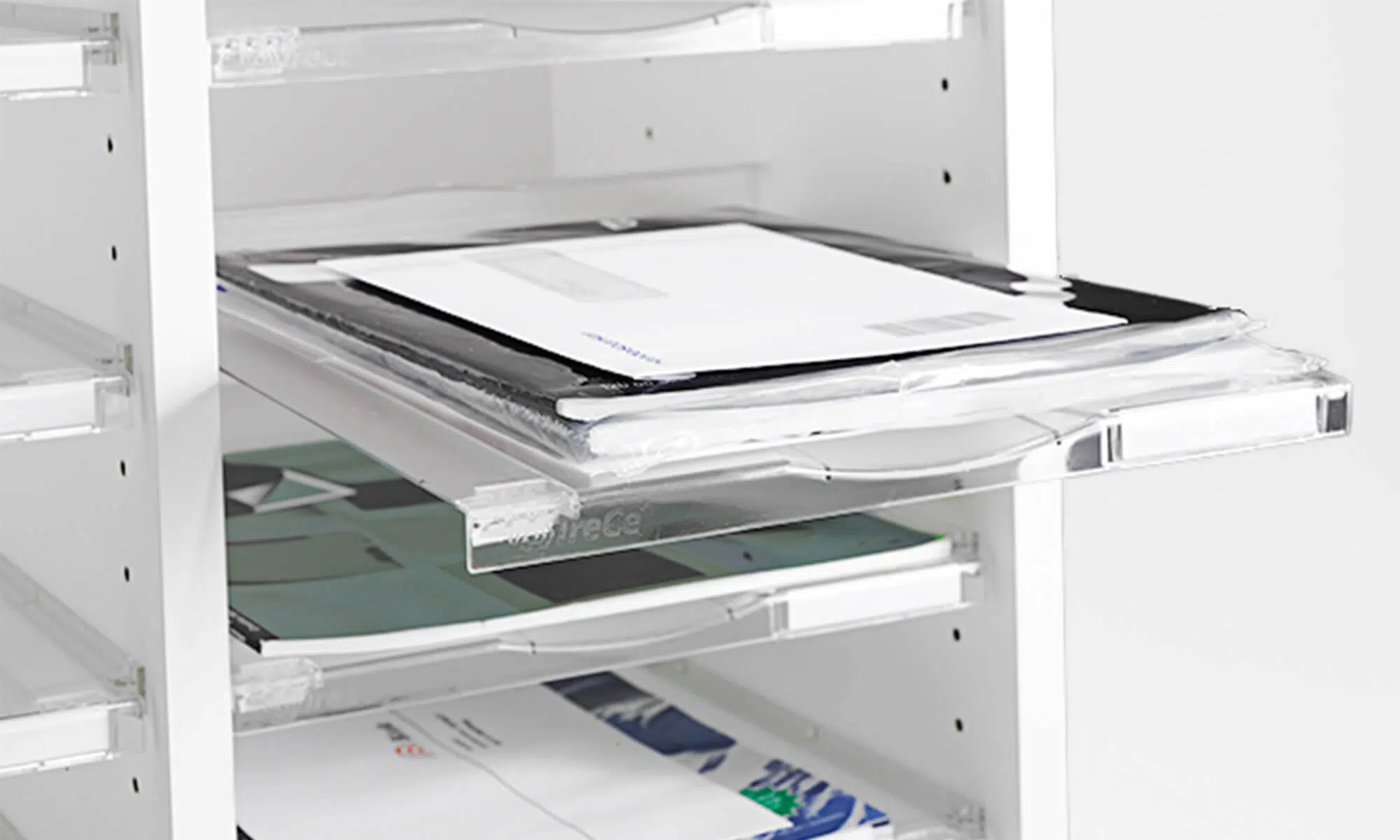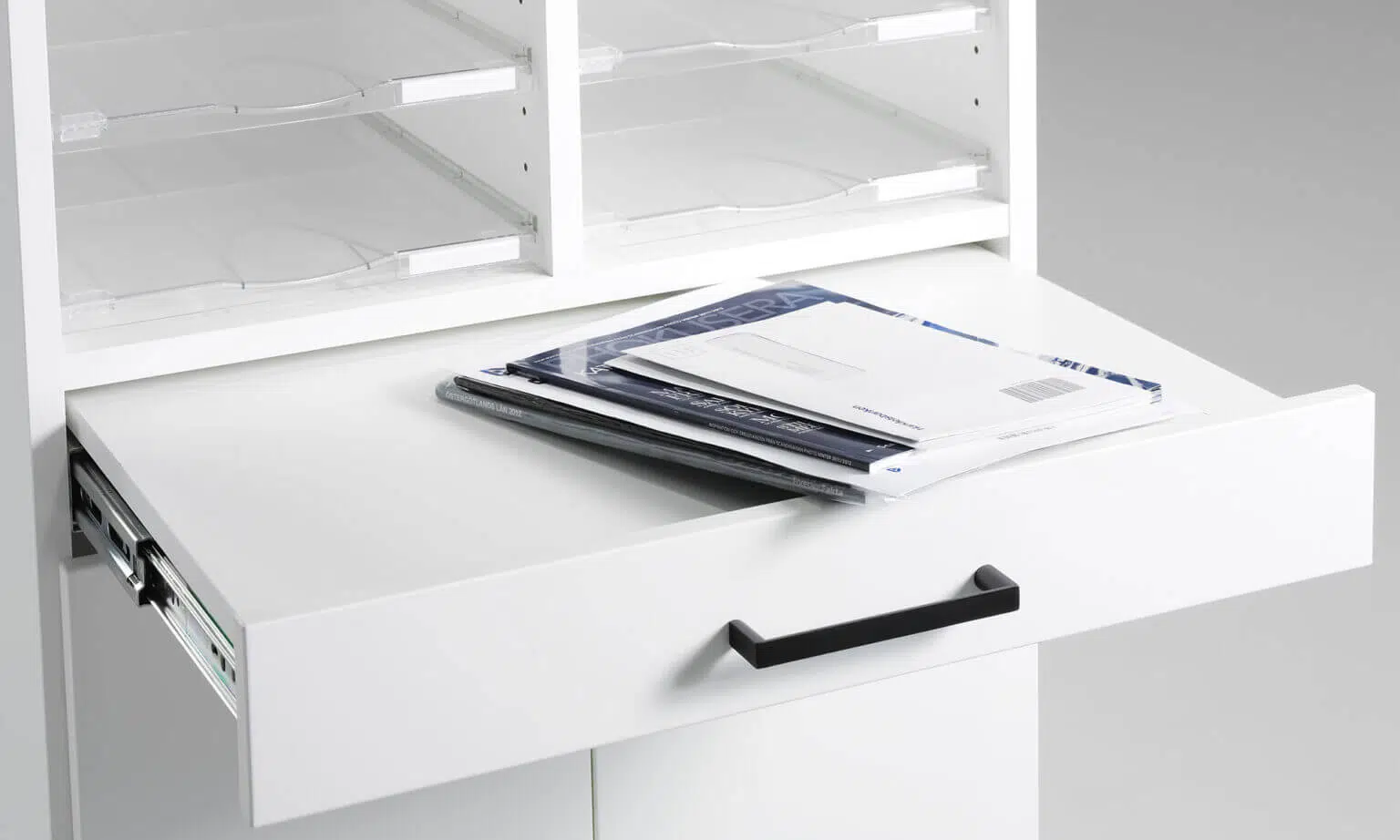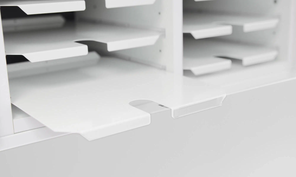 Complete module series for mail sorting. Adaptable to the needs, tastes and preferences of the height or width of the floor or wall with any number of mail shelves. Mail shelves with reach-through capability makes it possible to handle mail from both sides. The mail storage can be supplemented with more mail shelves for a division between the shelves of c/c 64 mm or c/c 32 mm. A pull-out shelf for extra work space is included as standard on most of our floor-standing mail sorts, which promotes an ergonomic working position.