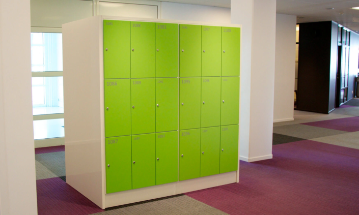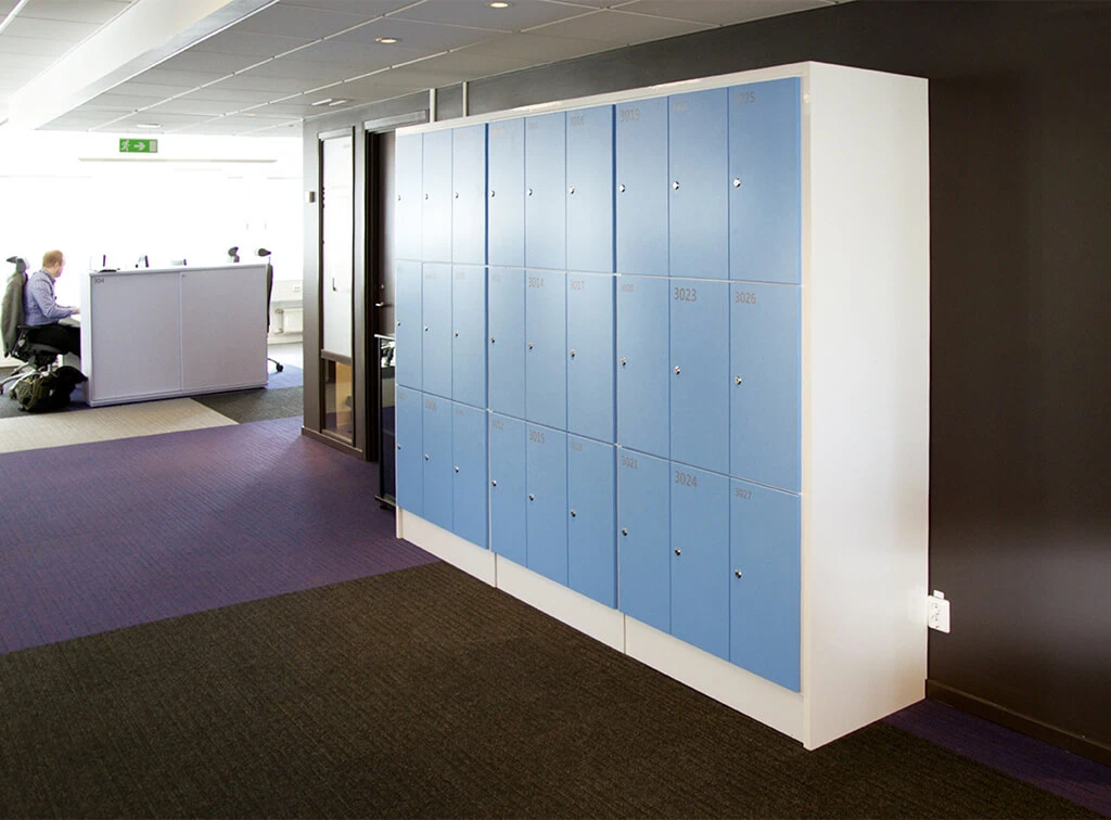 When Microsoft began work on rebuilding its Stockholm office there was a wish of being able to reuse parts of the existing interior. As TreCe had previously supplied Microsoft with furniture, only a few changes were made to reuse the existing interior. The storage compartments were supplemented with new doors in bright colors and screen printed numbers in various sizes. The compartments were moved out from the wall and built together, back to back, with the help of a cover panel in a white high gloss laminate. Thus valuable wall space was liberated and storage from two directions was made possible.