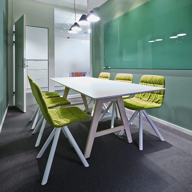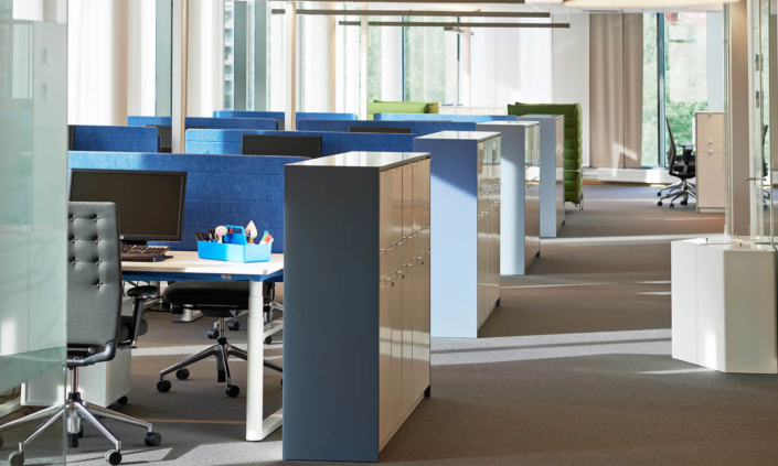 Several of the furniture pieces are from our standard range and some have been lacquered in optional colors. The custom storage at the desks is designed by Tine Evju Hager and colored in different shades to blend in with the bright, open space. Our recycling bin Kite has also found its place in the office landscape.