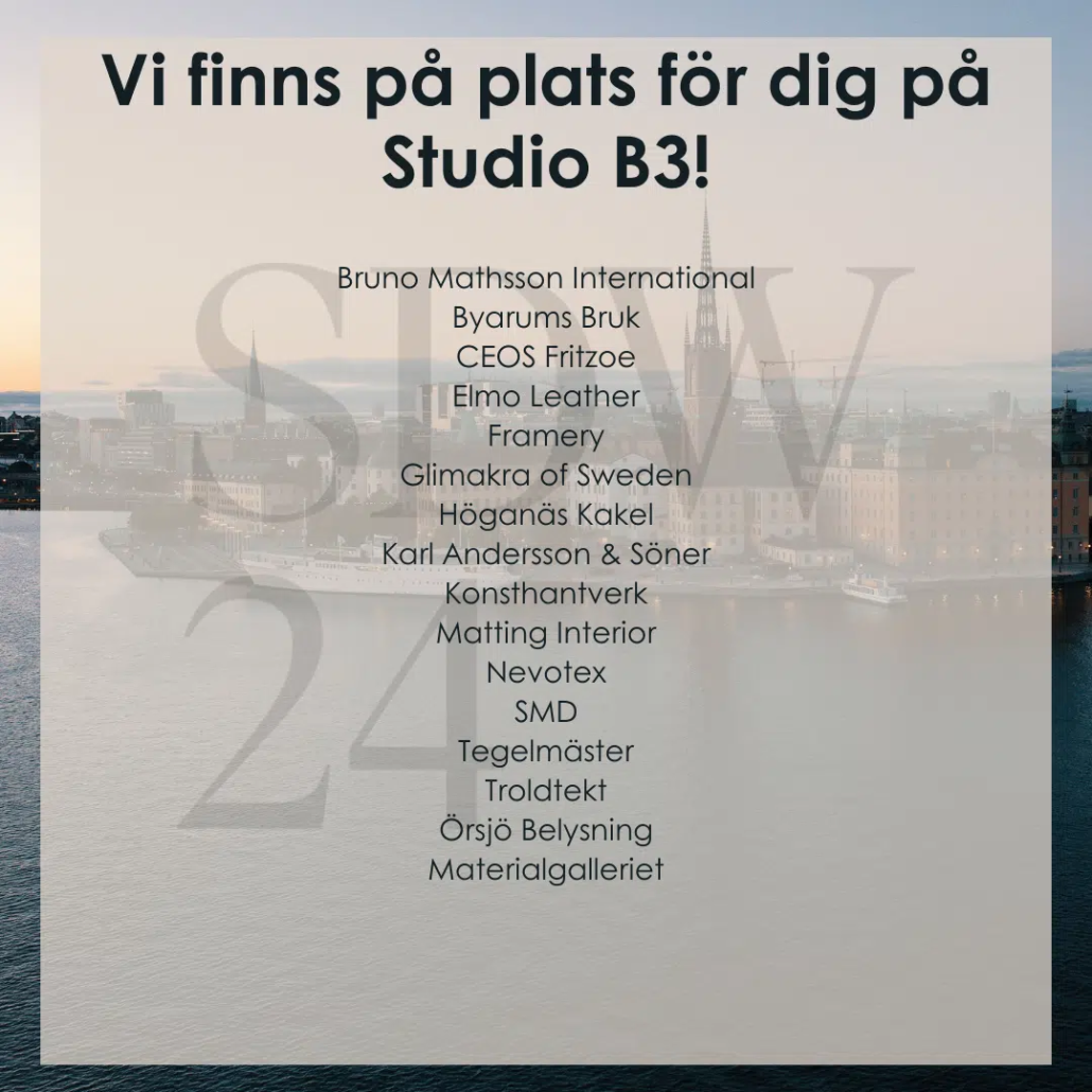 You will find the following companies at either Studio B3 on Barnhusgatan 3 or Stockholm Design District on Rosenlundsgatan 40.