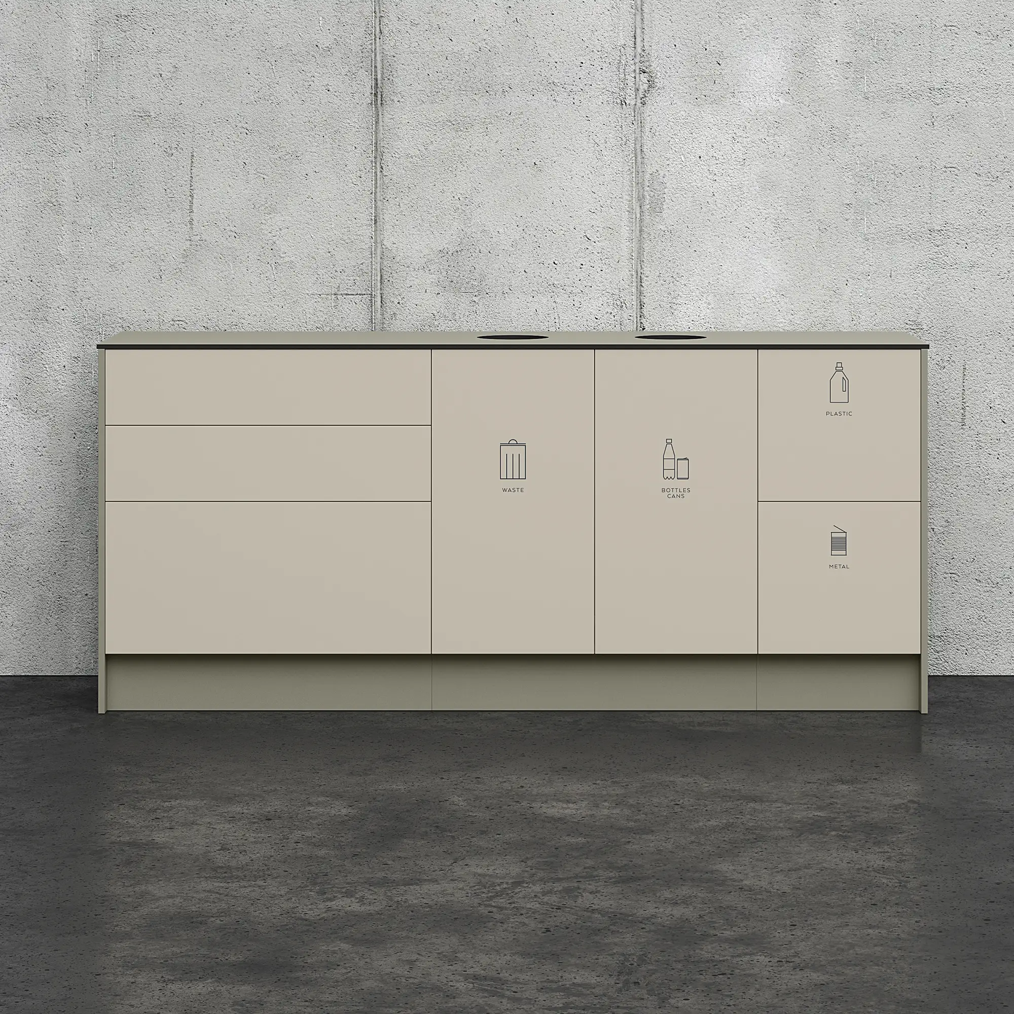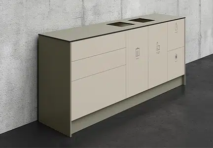 Passande säckhållare finns som tillbehör. Färdiga moduler med inkast i front har en utdragbar säckhållare innanför dörren, rekommenderad sopsäck 85-125 L. Bänkskivor i kompaktlaminat och högtryckslaminat går att få med håltagning.