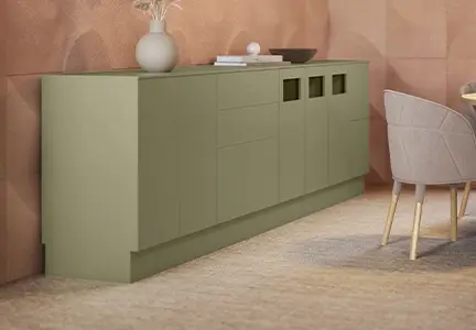 Stommar finns i standard vitt eller lackerade i en valfri NCS kulör. Synliga delar så som fronter, socklar, täcksidor och toppskivor finns i lackerad valfri NCS kulör, ek- eller asklaminat. Modulerna har sockel som standard, för en mer öppen design kan sockeln bytas ut mot lackerade benstativ mot tillägg. Benstativen finns i våra 11 standardkulörer.