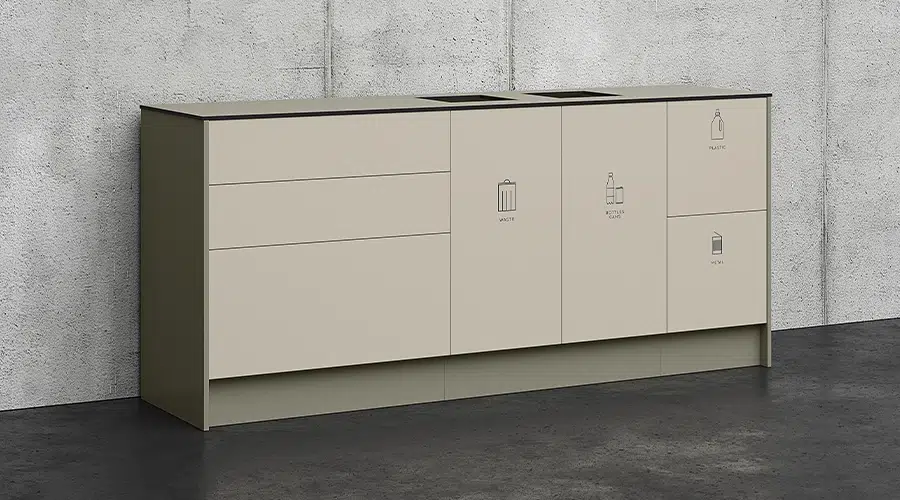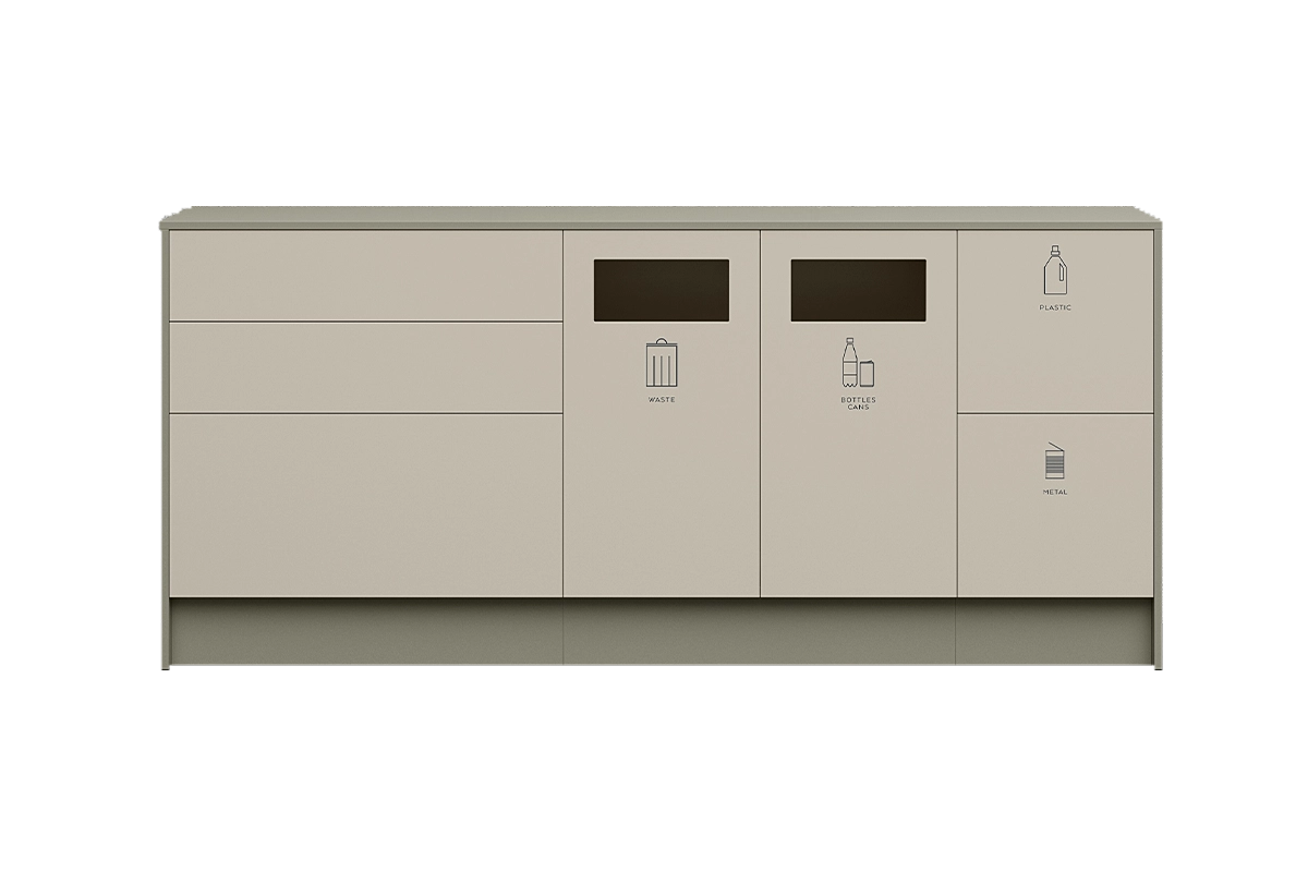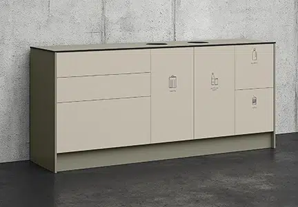 Space disk/miljödisk är flexibla moduler designade för gemensam förvaring och källsortering på kontor. Space är enkel att passa in tack vare sin enhetliga och genomtänkta design och har en komfortabel arbetshöjd, höjd 882 mm. De välarbetade detaljerna såsom dörrar i heltäckande design skapar en sömlös och stilren känsla.