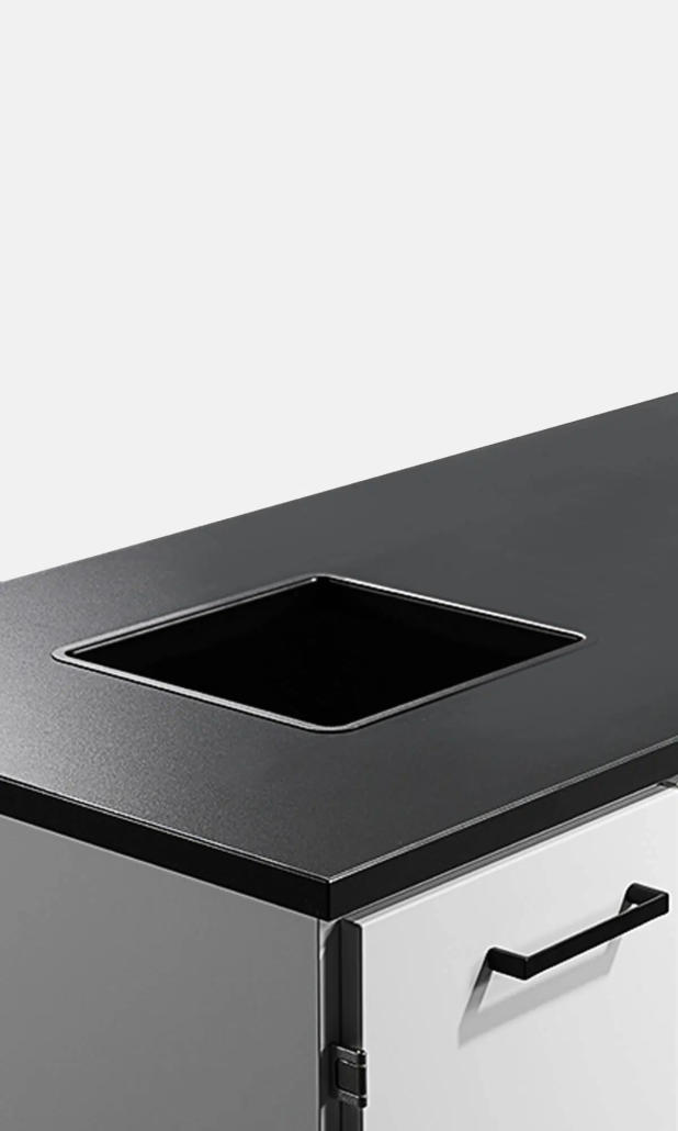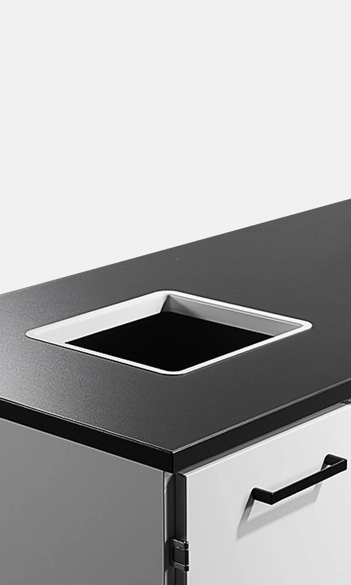 Håltagning och lock för enkel källsortering. Håltagning och lock till bänkskivor för källsortering av papper, PET-flaskor, burkar, plast, matavfall m.m. Locken förhindrar lukt och skapar en enhetligt uttryck. Välj den som passar bäst, alla håltagningar och lock är i material som är slitstarkt och håller i längden.