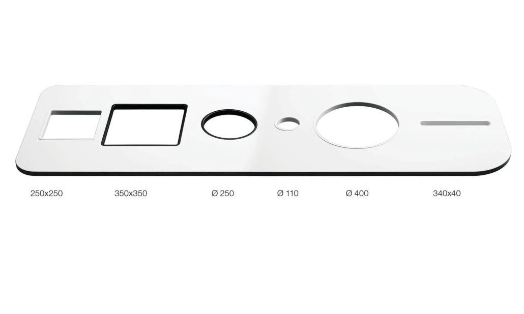 - Håltagning kvadratisk finns i vitt och svart med mått 250×250 och 350×350.
