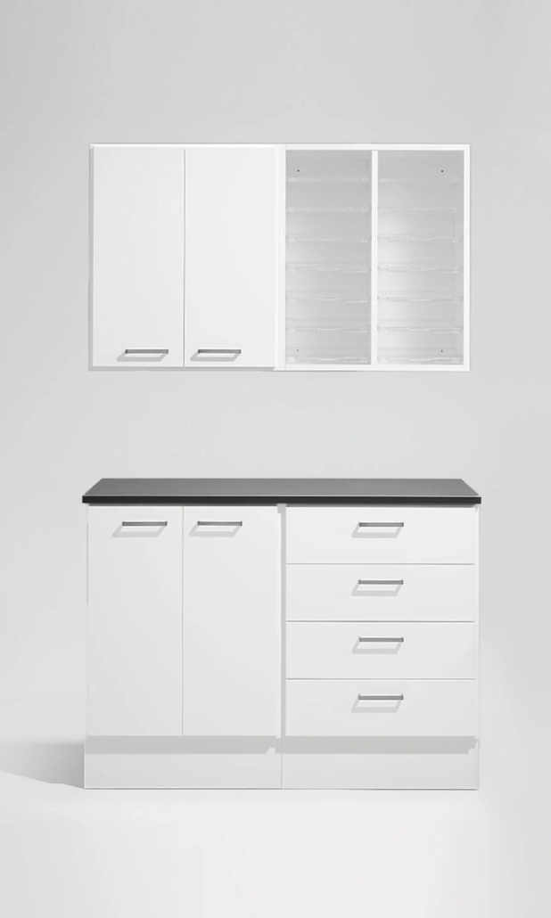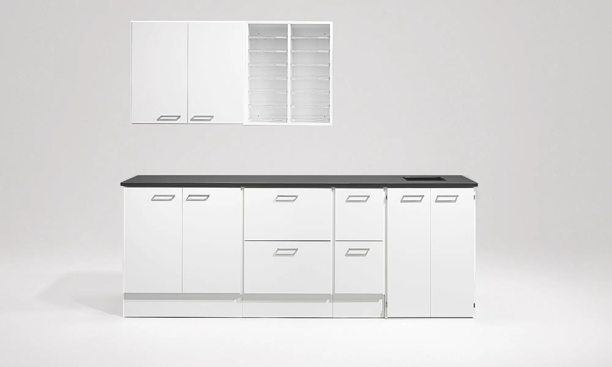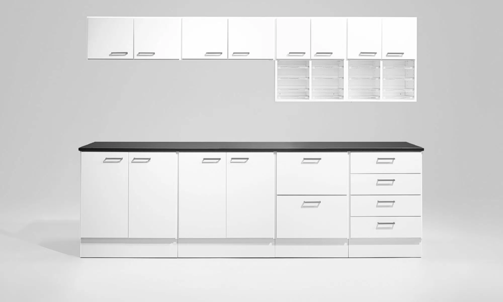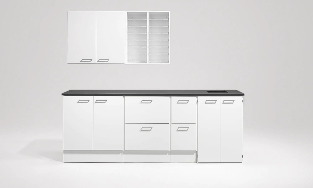 Sockel: Indragen sockel fram- och baktill med 4x justerbara fötter som är integrerade. Kan ersättas med justerbara ben i rostfritt stål, justerbara eller låsbara hjul, höjd 104 mm.