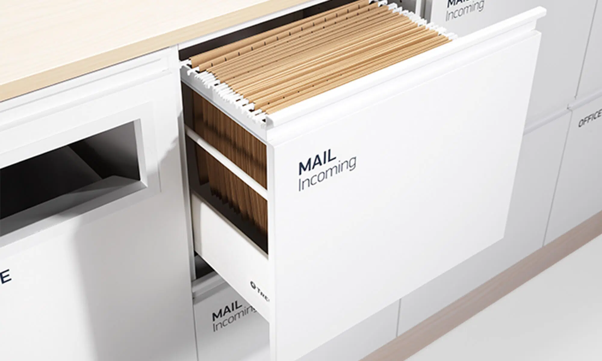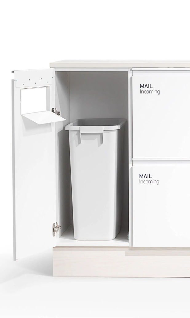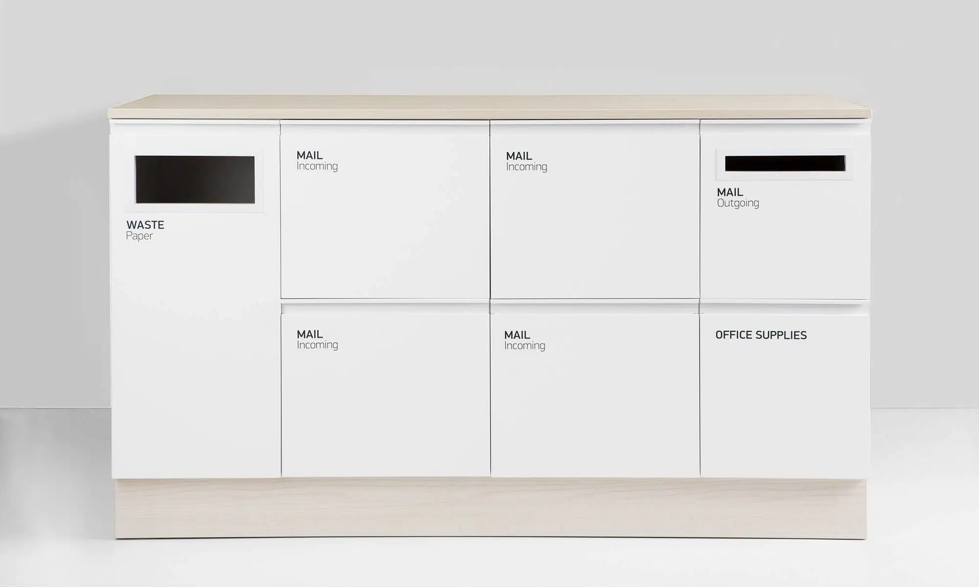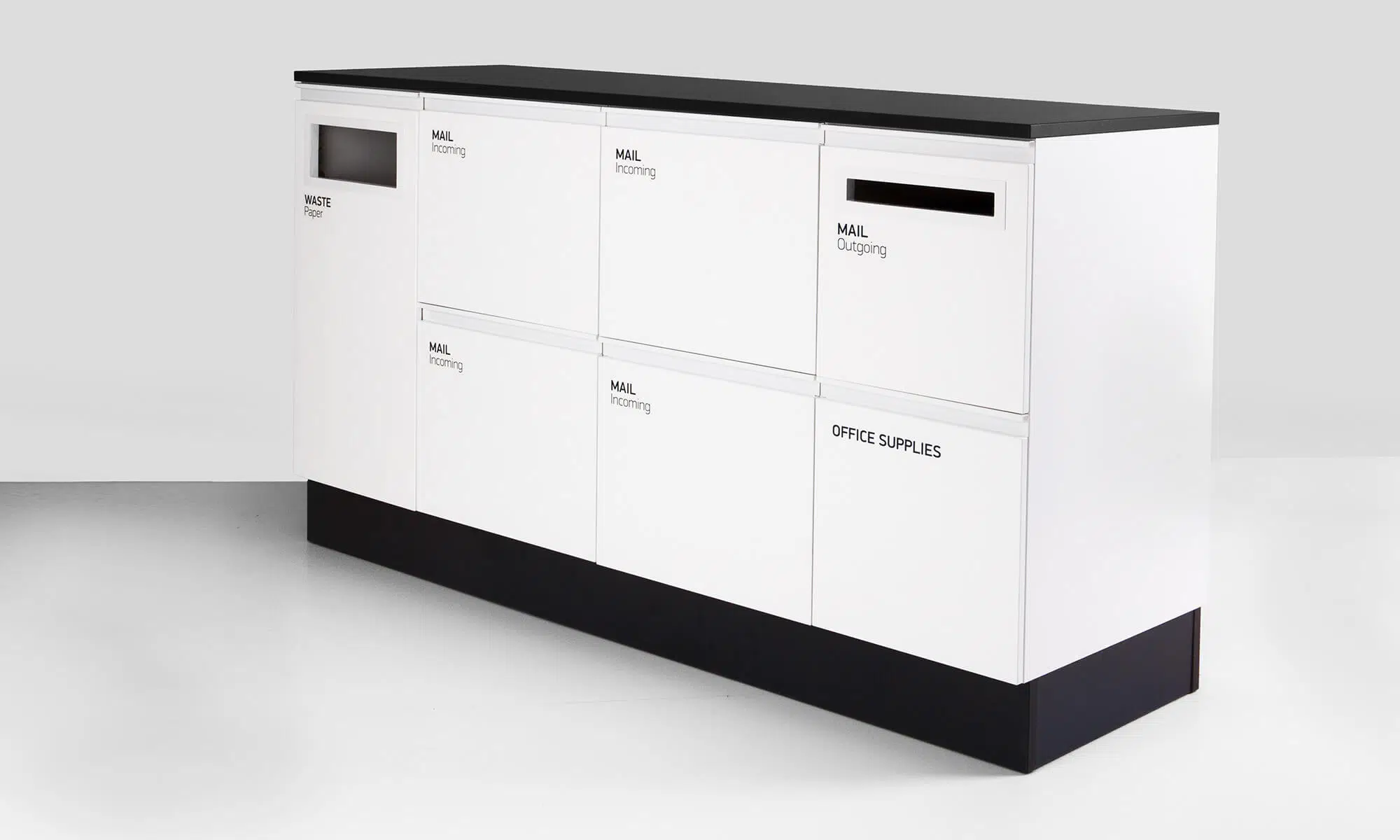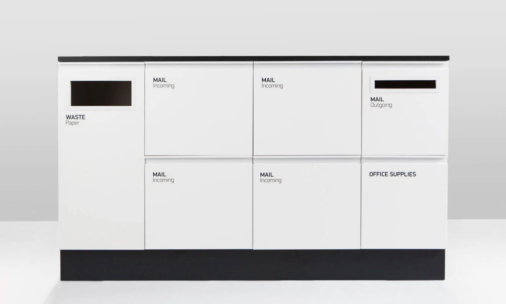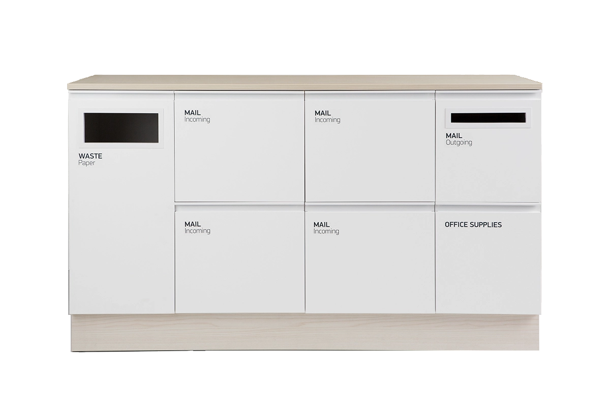 Platseffektiv postmöbel för den nya tidens postsortering. Mail finns i standard vitt med sockel och bänkskiva i högtryckslaminat, antracit eller ask. Mail rymmer plats för hängmappar i folioformat, postinkast för utgående post, en avfallsenhet och en låda för kontorsartiklar. Specialdesignade dekaler och 60-L kärl ingår.