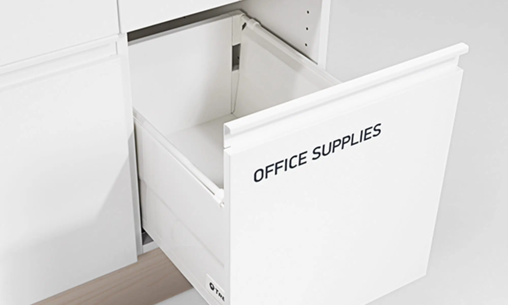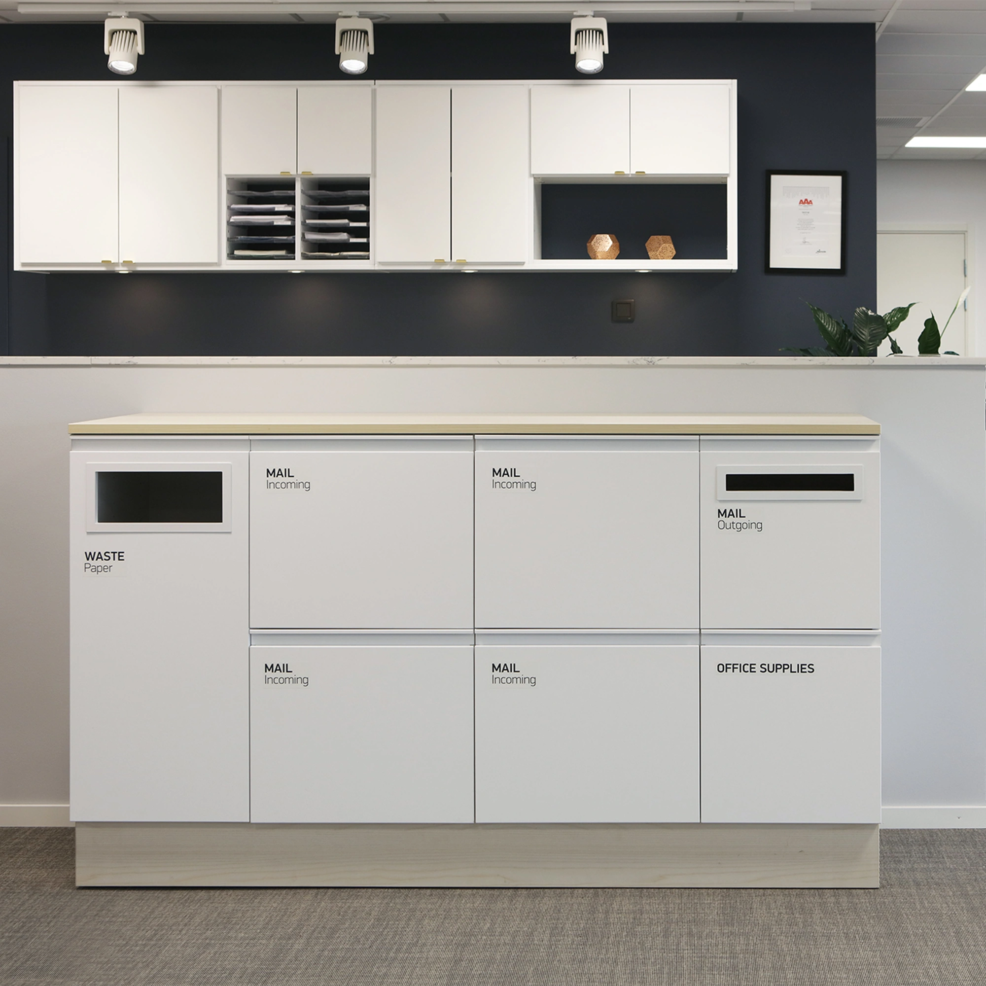 Inkast i vitt pulverlackerat stål. Alla lådor tål 65 kg och är fullt utdragbara med dämpning. Stomme i vitlaminat och fronter i vit UV-lack (NCS S 0500-N). Sockel och bänkskiva i högtryckslaminat från Formica ask eller grå. Mail rymmer post för upp till 200 personer.