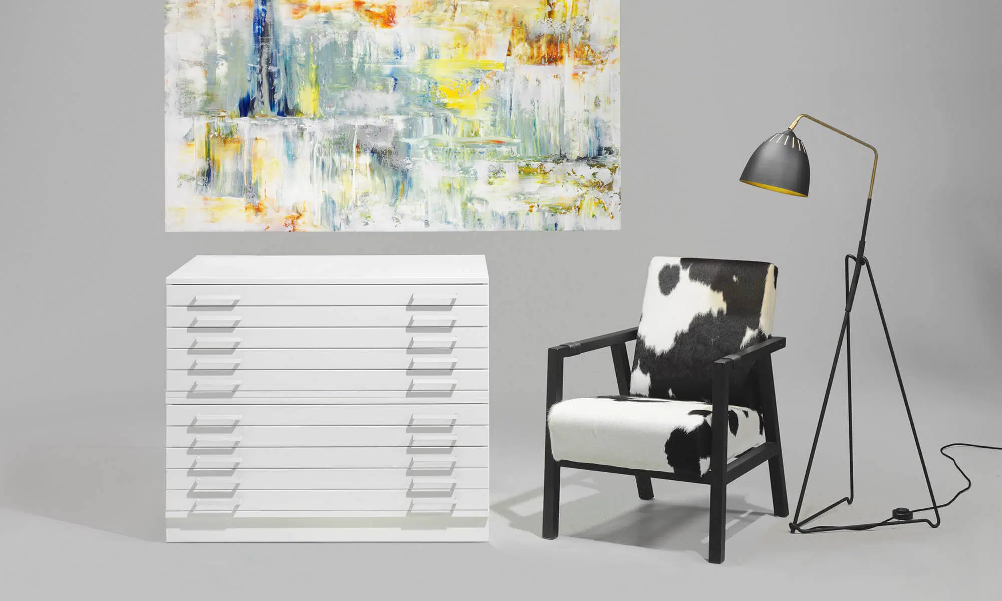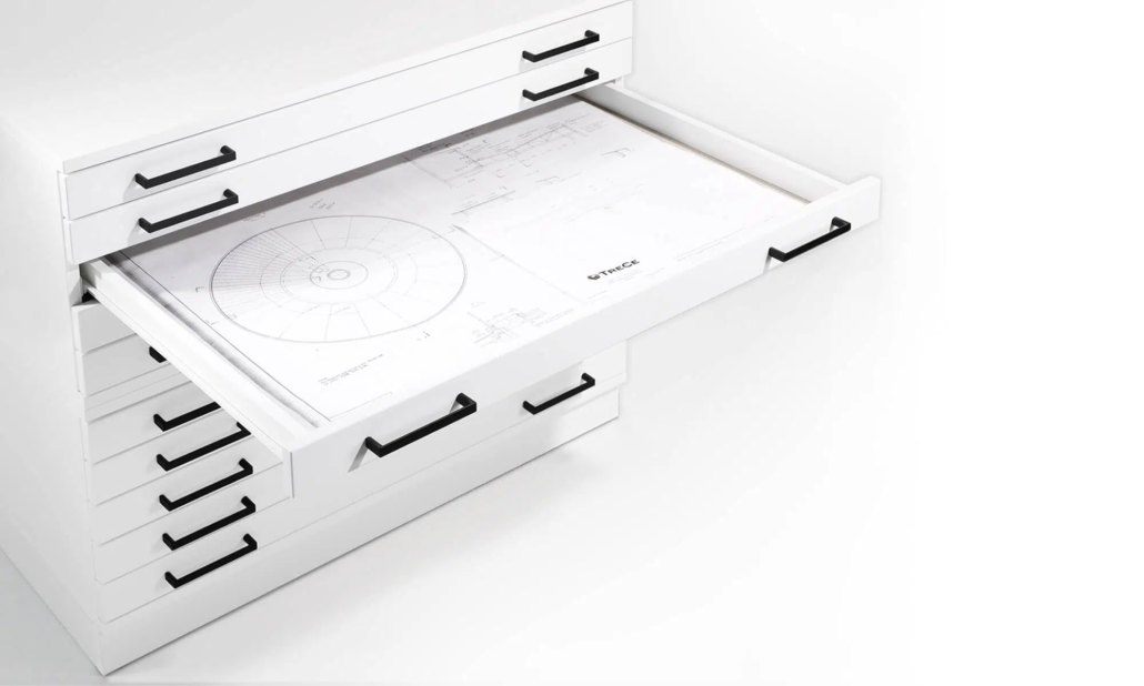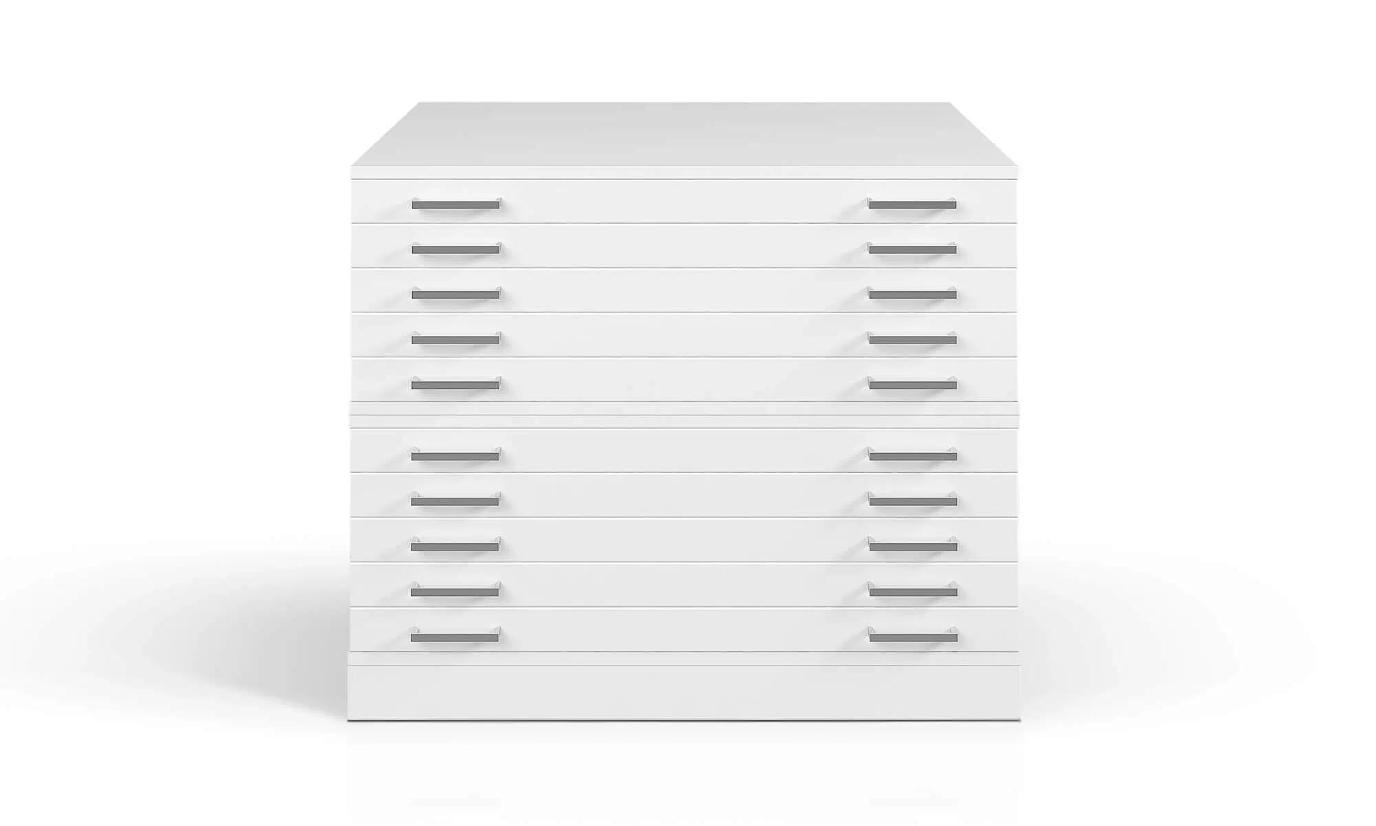 Ritningshurts för A0 och A1-format. Vit direktlaminerad stomme och vitlackade lådförstycken (NCS S 0500-N) med rostfria handtag. Lådor med integrerade hjullager i skenorna gör hurtsen mycket lättarbetad för en mer funktionell och smidig förvaring.