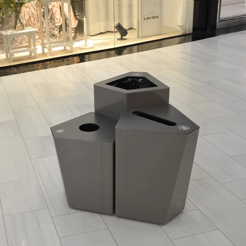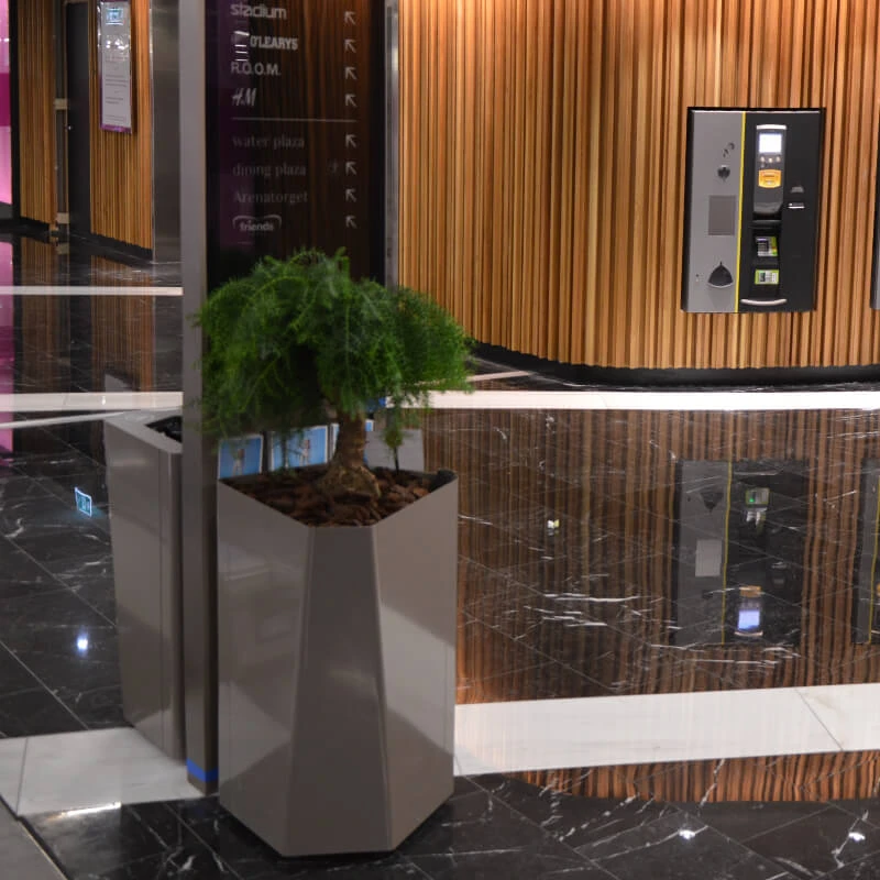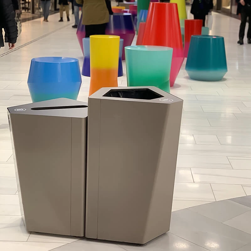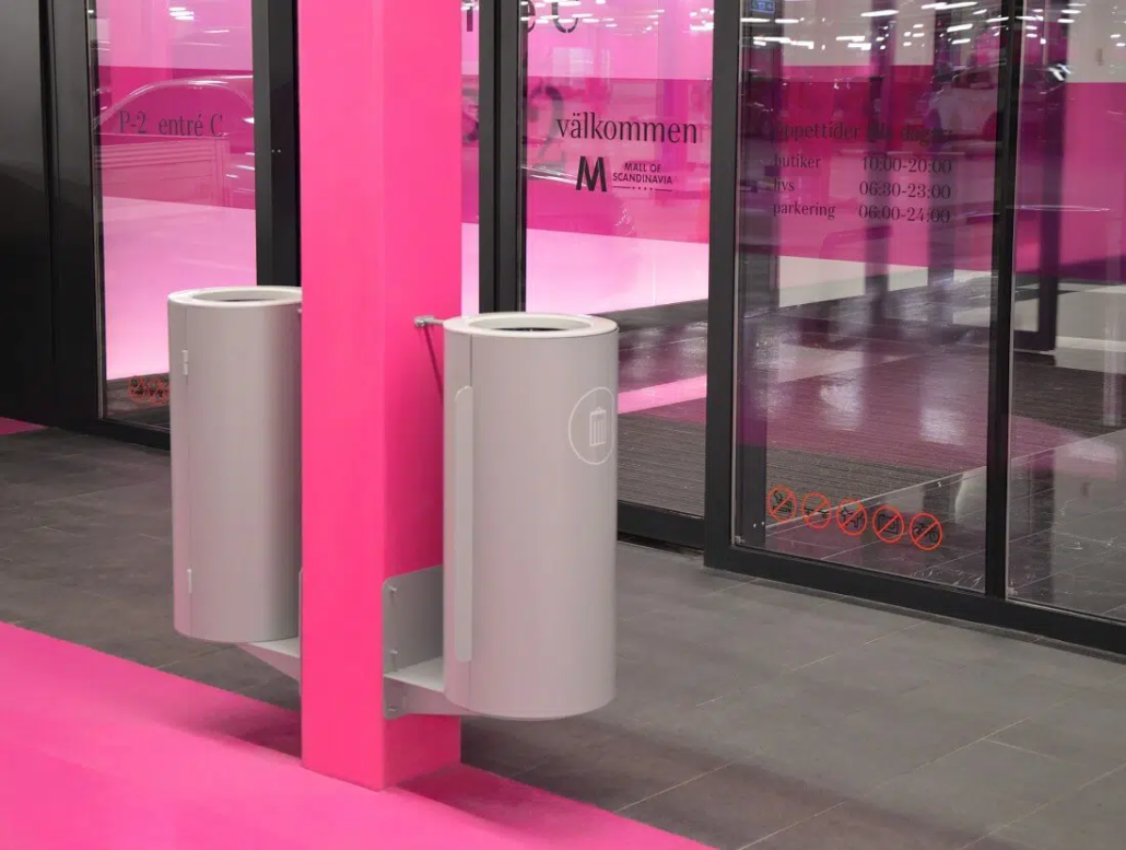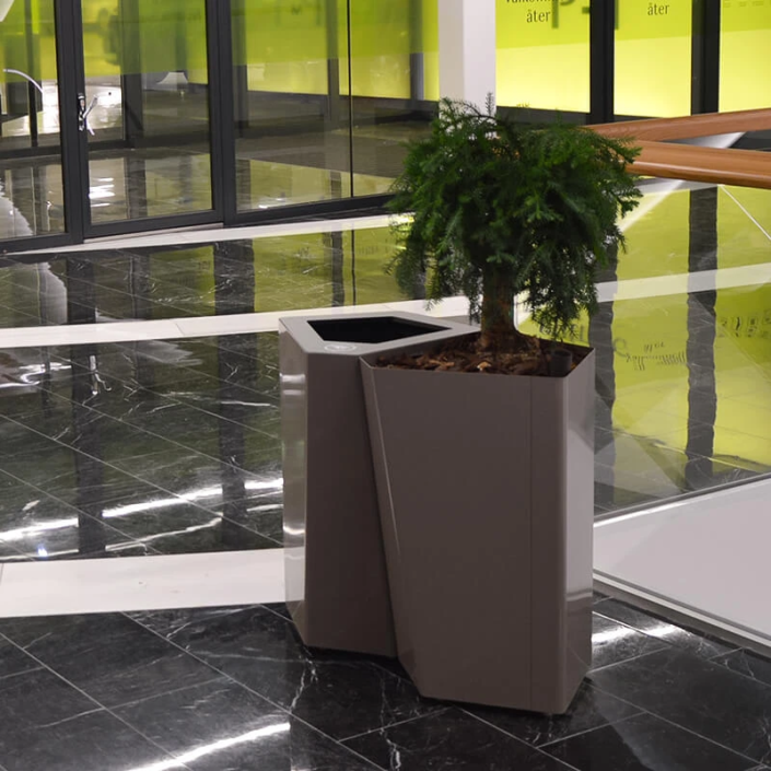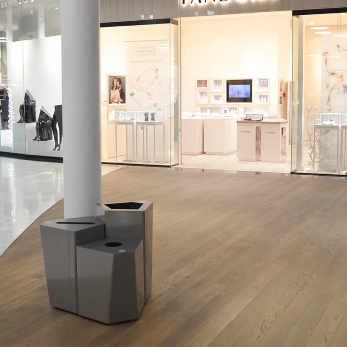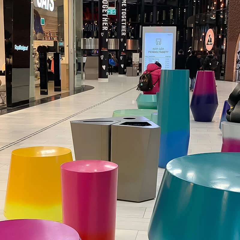 TreCe fick förförfrågan att leverera papperskorgar som kunde passa i gallerians olika områden – vår lösning var miljösorteringsenheterna Kite och Birdie.
